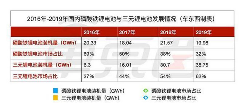 ▲2016年-2019年國內磷酸鐵鋰電池與三元鋰電池發(fā)展情況對比