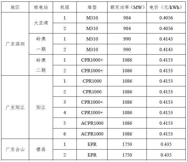 表1 廣東境內(nèi)核電機組上網(wǎng)電價