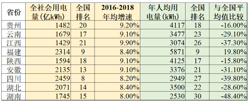 從表1可見,表中省份的全社會用電量規(guī)模與人均用電量呈現(xiàn)明顯的錯配現(xiàn)象。在大陸地區(qū)31個省份中,GDP增長較快省份全社會用電量規(guī)模普遍排名中段,而年人均用電量普遍排名靠后。除福建省外,陜西、貴州低于全國人均用電量15%左右,其余省份普遍低于全國人均用電量30%~50%左右。這一方面與GDP增長較快省份的人口規(guī)模、產業(yè)結構有關;另一方面,這些省份多處于華中、西南地區(qū),將大量承接東部產業(yè)轉移,未來人均用電量和全社會用電量都將具有較大增長空間,對電能需求更加旺盛、對電網保障作用更加依賴。