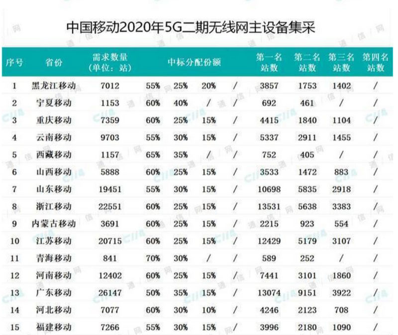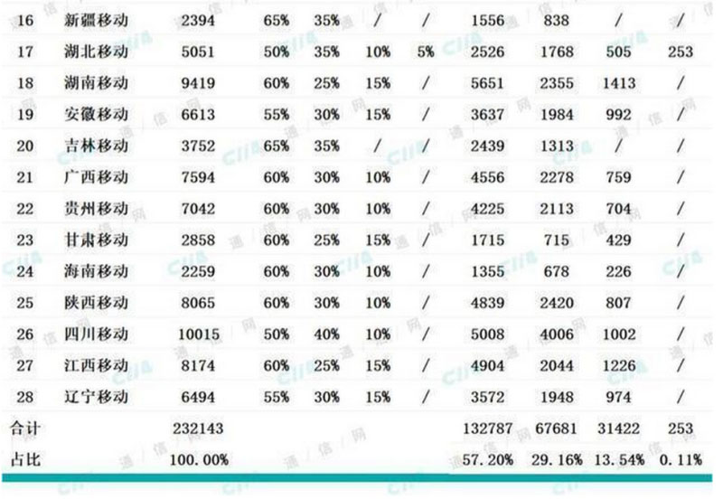 其一,招標(biāo)份額分配比例相對(duì)比較統(tǒng)一,基本上按60%+25%+15%的比例分配,且各省大多采取“2+1”模式進(jìn)行份額招標(biāo)。這樣的標(biāo)配比例,既不會(huì)讓某一家設(shè)備商一家獨(dú)大,最終導(dǎo)致尾大不掉,也不會(huì)由于供應(yīng)商過(guò)多導(dǎo)致后期運(yùn)維壓力。實(shí)際這也是運(yùn)營(yíng)商一直使用的以3家左右為主的一貫舉措。