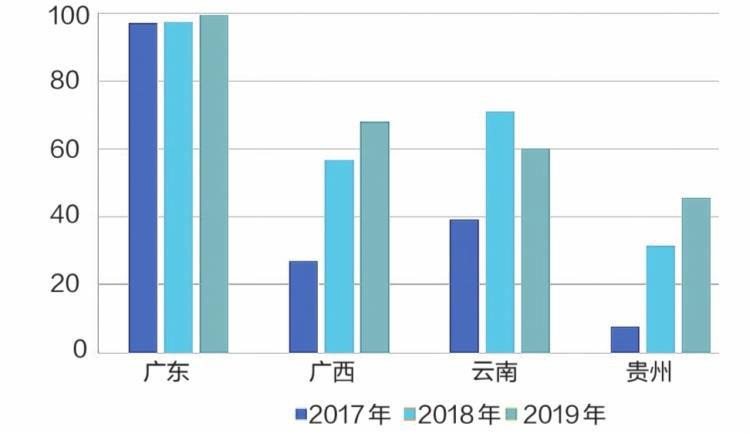 與數(shù)量規(guī)模維持上升相比,售電公司實際參與市場競爭的比例并不高。受競爭、技術(shù)、資源等因素的影響,2019年南方區(qū)域?qū)嶋H參與市場化交易的售電公司不足300家,占注冊市場主體比例38%,較2018年下降4個百分點。分省區(qū)看,廣東、廣西售電公司參與市場的數(shù)量以及比例均較2018年有所下降;云南售電公司參與市場的數(shù)量以及比例則較2018年有所提高;貴州參與市場的售電公司數(shù)量有所增長,但實際參與交易的比例較2018年基本持平。
