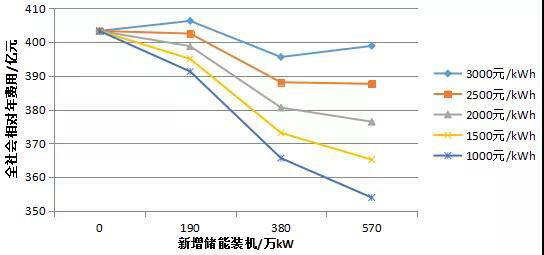 若儲能綜合造價為3000元/kWh,新增儲能裝置容量達(dá)到380萬kW/760萬kWh,全社會總年費(fèi)用可降低7.7億元,平均每度電價格可降低0.007元/kWh;若儲能綜合造價降至2500元/kWh,全社會總年費(fèi)用可降低15.2億元,平均每度電價格可降低0.014元/kWh。儲能價格下降越多,全社會經(jīng)濟(jì)性越好,社會所有參與者均可以從中獲益,關(guān)鍵在于紅利如何分配。