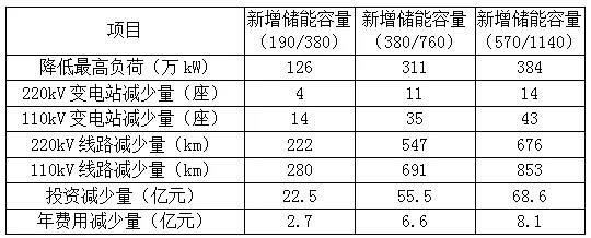 建設(shè)分布式儲能裝置后,可降低系統(tǒng)最高負(fù)荷,減少高壓電網(wǎng)輸電變工程的建設(shè),減少電網(wǎng)側(cè)投資。220kV電網(wǎng)變電容載比按1.9計算,110kV電網(wǎng)變電容載比按2.1計算,儲能對電網(wǎng)側(cè)投資的影響結(jié)果(見表3)。