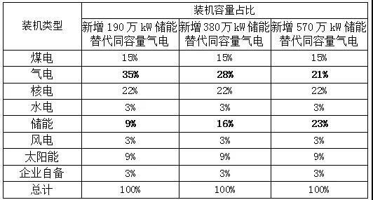 遠(yuǎn)景夏季日最小負(fù)荷率為0.62,冬季日最小負(fù)荷率為0.46,日峰谷差較大。采取新增大規(guī)模儲能裝置替代同容量氣電機(jī)組,以實現(xiàn)用電負(fù)荷的削峰填谷,優(yōu)化負(fù)荷曲線。新增儲能規(guī)模及相應(yīng)電源裝機(jī)比例(見表2)。