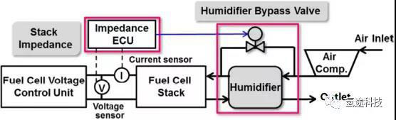 本田CLARITY燃料電池系統(tǒng)的陰極回路具有加濕器,并與旁通閥并聯(lián)。基于CCM含水量和電堆阻抗的關(guān)系特性,依據(jù)測得的電堆阻抗,調(diào)節(jié)旁通閥開度,定量地控制進(jìn)堆氣體濕度,確保電堆CCM含水量控制在最佳運行濕度的上限和下限內(nèi),從而令堆內(nèi)濕度維持在適宜的水平。
