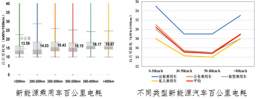 從統(tǒng)計數據可以看出,我國新能源乘用車百公里電耗總體在10-20kWh區(qū)間,平均電耗為15.1kWh,達到了國際先進水平。但與公告能耗數據相比還有一定差距,其原因主要在于國家平臺的數據是基于車輛實際運行數據,把空調、電氣附件等電耗、都計算在內。具體來說,出租車、公務車、租賃車和私人車輛4種車型中,出租車的平均電耗最高,私人乘用車電耗最低;車速在30-80km/h范圍內,電耗水平相對較低。