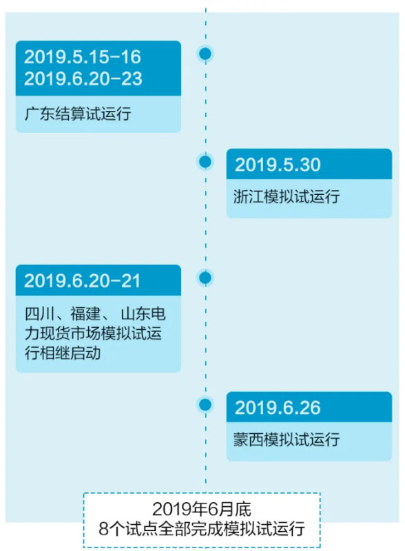 2015年3月啟動的新一輪電力體制改革提出,“逐步建立以中長期交易規(guī)避風險,以現(xiàn)貨市場發(fā)現(xiàn)價格,交易品種齊全、功能完善的電力市場”。2017年8月,國家確定南方(以廣東起步)、蒙西、浙江、山西、山東、福建、四川、甘肅8個地區(qū)作為第一批試點,2019年6月,首批8個電力現(xiàn)貨試點已全部啟動模擬試運行。2020年3月,廣東進行電力現(xiàn)貨市場全月結(jié)算試運行系統(tǒng)測試。