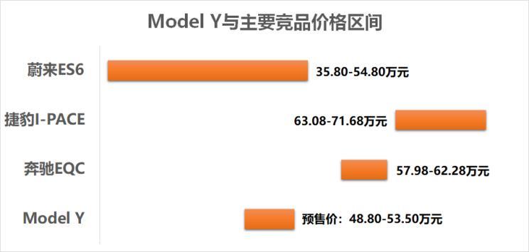 好在目前純電動中型SUV這個細分市場的競爭并不激烈,綜合價格和級別來看,Model Y面臨的主要競爭對手是奔馳EQC、捷豹I-PACE、寶馬iX3(目前未上市,且無預售價格)、蔚來ES6等。從價格上看,Model Y占據(jù)一定優(yōu)勢,僅蔚來ES6起售價比Model Y預售價格更低,但后者的預售價區(qū)間也被前者完全包括。這主要是源于Model Y與Model 3上驚人的零部件通用率產(chǎn)生的規(guī)模效應,而且考慮到特斯拉上海超級工廠生產(chǎn)成本比國外低65%(特斯拉官方宣布的Model 3生產(chǎn)成本對比),以及無鈷電池在未來逐漸應用,Model Y國產(chǎn)后售價有可能和Model 3一樣進一步下調(diào)。