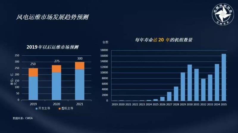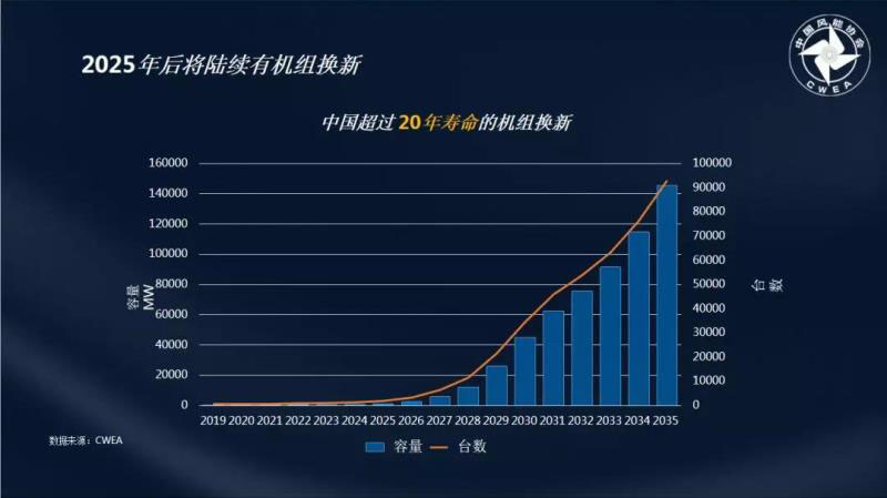 在未來,2020-2025年間的風(fēng)電市場將從已核準(zhǔn)搶電價(jià)、已核準(zhǔn)轉(zhuǎn)平價(jià)、平價(jià)基地等方面轉(zhuǎn)向平價(jià)項(xiàng)目、分散式風(fēng)電項(xiàng)目和換新項(xiàng)目。由于風(fēng)電機(jī)組的壽命普遍在20~25年,在2030年~2035年間,有大量的風(fēng)電機(jī)組需要換新。所以,在未來的風(fēng)電市場中,風(fēng)電運(yùn)維市場規(guī)模將不斷擴(kuò)大。根據(jù)預(yù)測,2035年,達(dá)到壽命上限的風(fēng)電機(jī)組容量將達(dá)到150GW,臺數(shù)將超過9萬臺。