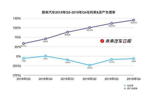 蔚來汽車2018年Q3-2019年Q4毛利率&資產(chǎn)負(fù)債率,制圖:未來汽車日報(bào)