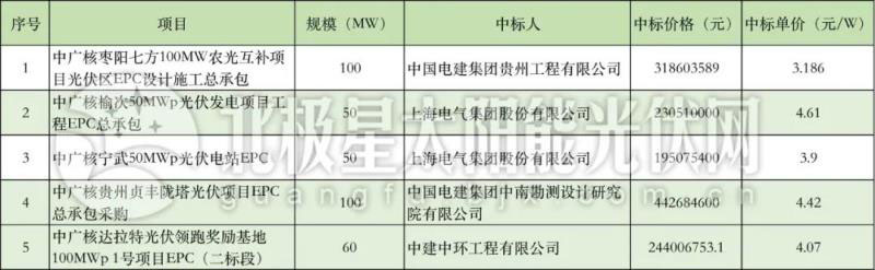 北極星太陽能光伏網(wǎng)統(tǒng)計了2020年來中廣核光伏電站EPC項目的中標情況,其中上海電氣已收獲中廣核100MW訂單,中國電建集團已收獲中廣核200MW訂單,中標單價最低的項目為中廣核棗陽七方100MW農(nóng)光互補項目光伏區(qū)EPC設計施工總承包,單價為3.186元/W。