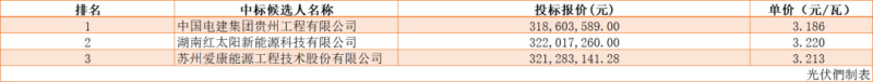 根據(jù)公示,中國電建集團貴州工程有限公司以總價318,603,589元,單價3.186元/瓦的報價成功中標。需要注意的是,根據(jù)招標公告,該EPC范圍不包含外線及升壓站等費用。