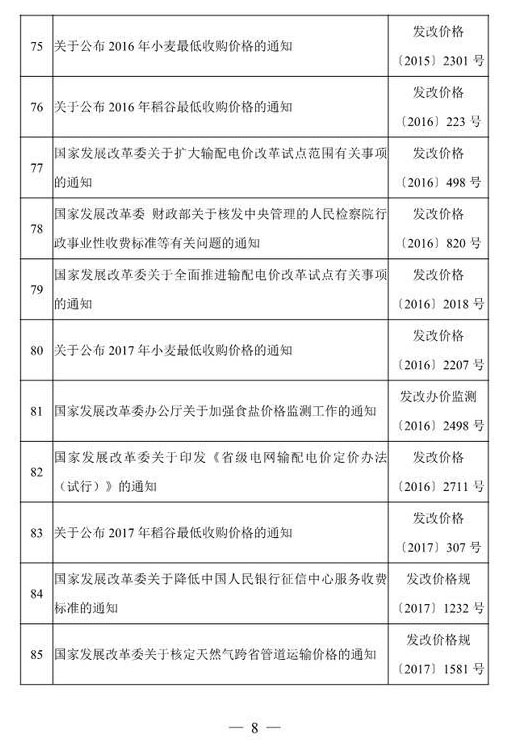 為貫徹落實黨中央、國務院關(guān)于深入推進簡政放權(quán)、放管結(jié)合、優(yōu)化服務,改善營商環(huán)境的有關(guān)要求,經(jīng)商國務院相關(guān)部門,決定廢止《國家物價局、財政部關(guān)于發(fā)布中央管理的地礦系統(tǒng)行政事業(yè)性收費項目及標準的通知》(價費字〔1992〕251號)等85件價格規(guī)范性文件,現(xiàn)予以公告。