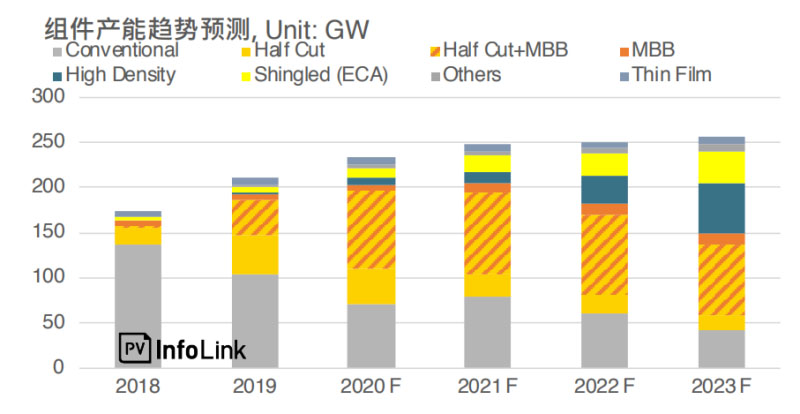 根據(jù)PVInfoLink數(shù)據(jù),盡管從2019年開始,組件技術(shù)便開始以半片+多主柵為標(biāo)配進(jìn)行技改或者擴(kuò)產(chǎn),截止2019年底,半片+多主柵的產(chǎn)能達(dá)到約38GW,但實(shí)際產(chǎn)量到2020年2季度才開始逐漸升溫,2020年1季度半片+多主柵的產(chǎn)能僅有500-700MW/月。
