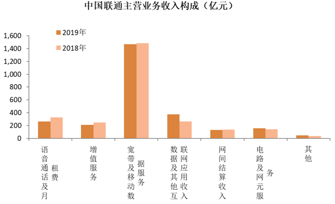 中國聯(lián)通2019年實現(xiàn)主營業(yè)務(wù)收入人民幣2644億元,較2018年同比上漲0.3%。在這2644億元的主營業(yè)務(wù)中,語音通話及月租費、增值服務(wù)、寬帶及移動數(shù)據(jù)服務(wù)、網(wǎng)間結(jié)算收入相比2018年同期都有所下降。數(shù)據(jù)及其他互聯(lián)網(wǎng)應(yīng)用收入和電路及網(wǎng)元服務(wù)相比2018年同期有所增長。