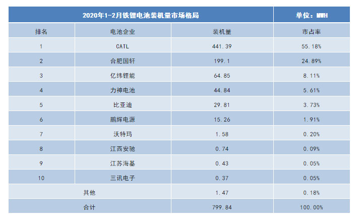 從2020年1-2月磷酸鐵鋰電池裝機(jī)格局來(lái)看,前五企業(yè)磷酸鐵鋰總裝機(jī)為779.99MWh,市場(chǎng)份額占比97.51%,較19年前五的市場(chǎng)份額占比增長(zhǎng)2.54%。TOP5企業(yè)稍有變化,力神電池進(jìn)入榜內(nèi)且市占率超過(guò)比亞迪,江西安馳退出五強(qiáng)。