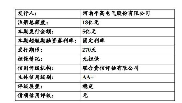 中國儲能網(wǎng)訊:3月23日,河南平高電氣股份有限公司發(fā)布2020年度第一期超短期融資券募集說明書,注冊總額度為18億元,本次擬發(fā)行5億元超短融,發(fā)行期限270天。