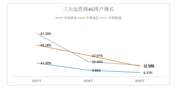 我們看看2017年至2019年三大運(yùn)營(yíng)商4G用戶同比增長(zhǎng)率。