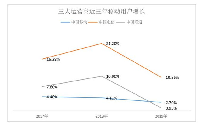 如果看2017年至2019年移動(dòng)用戶同比增長(zhǎng)率,也許我們能清晰的感受到運(yùn)營(yíng)商移動(dòng)用戶增幅放緩的局面。