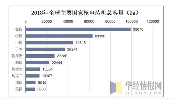 2019年,全球共有442臺(tái)核電機(jī)組可運(yùn)行,凈裝機(jī)容量為392.4GWe,54臺(tái)機(jī)組在建。目前在運(yùn)核電機(jī)組裝機(jī)容量排名前五的國(guó)家分別是美國(guó)、法國(guó)、中國(guó)、日本、俄羅斯,中國(guó)排名第三。根據(jù)國(guó)際原子能機(jī)構(gòu)及中國(guó)核能行業(yè)協(xié)會(huì)的統(tǒng)計(jì),截至2018年12月31日,中國(guó)核能裝機(jī)容量位列全球第3位。