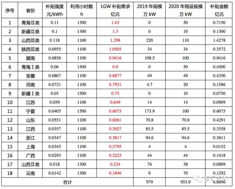 參考2019年競價(jià)項(xiàng)目結(jié)果,結(jié)合項(xiàng)目完成率情況,上表中的項(xiàng)目總規(guī)模為953.9萬kW,所需補(bǔ)貼為6.89億元。加上貴州、內(nèi)蒙兩省,所需補(bǔ)貼恰好為10億元。