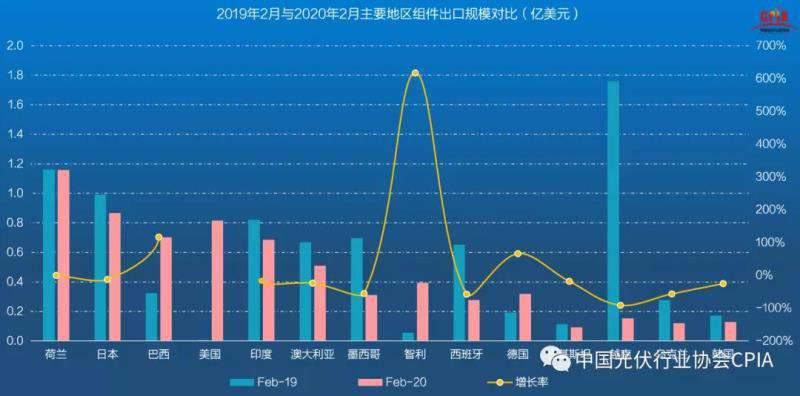 【智利】2月組件出口規(guī)模同比增長(zhǎng)616.9%。作為可再生能源投資的熱土,憑借低廉的勞動(dòng)力價(jià)格、豐富的光照資源(世界最好的輻照強(qiáng)度)以及良好的融資環(huán)境使光伏發(fā)電取得了巨大的優(yōu)勢(shì)。在智利的國(guó)家電力拍賣(mài)中,清潔能源可以利用價(jià)格優(yōu)勢(shì)擊敗化石能源,因此,智利政府提出了煤炭退役計(jì)劃,預(yù)計(jì)到2030年,太陽(yáng)能將成為智利主要的電力來(lái)源,覆蓋超過(guò)30%的國(guó)內(nèi)電力需求。此外,智利是第一個(gè)跟中國(guó)簽訂自由貿(mào)易協(xié)定的拉丁美洲國(guó)家,中國(guó)產(chǎn)品出口到智利97%沒(méi)有關(guān)稅,疊加該國(guó)有鼓勵(lì)光伏發(fā)展的政策,大大驅(qū)動(dòng)了光伏在智利的快速發(fā)展。智利國(guó)家電力協(xié)調(diào)局表示2019年本國(guó)太陽(yáng)能發(fā)電量7345GWh,占比9.4%,距離30%的目標(biāo)相差較大,因此未來(lái)發(fā)展空間依舊很大。根據(jù)公開(kāi)資料顯示,智利要求曾前往中國(guó)、西班牙、法國(guó)、意大利、韓國(guó)或伊朗的船舶,所有船員必須在離開(kāi)上述國(guó)家后通過(guò)14天的隔離檢疫,才能進(jìn)入智利。否則,他們不會(huì)收到港口的清關(guān)通知。如此看來(lái),對(duì)于智利的影響主要還是來(lái)自港口清關(guān)等物流方面的影響。1-2月該地區(qū)組件市場(chǎng)出口額占比前五的企業(yè)分別為東方日升(39.7%)、東方環(huán)晟(20.0%)、天合(18.3%)、晶澳(15.7%)、正泰(3.3%)。