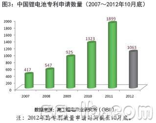 2007年中國鋰電池相關技術專利申請僅有417項,而到了2011年相關技術專利申請達到1899項,是4年前的4.5倍(圖3)。雖然2012年前10個月的專利數(shù)量有所下滑,但其總數(shù)超過1000件,幾乎是日本、韓國、美國等所有其他國家鋰電池技術專利的總和。