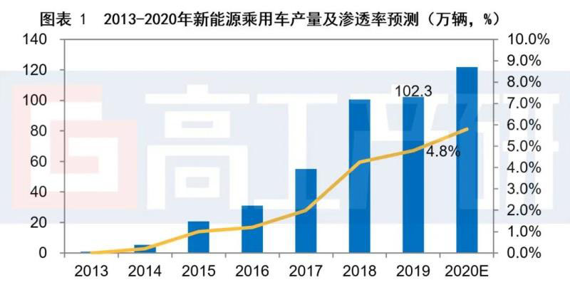從市場(chǎng)前景看:雖然受疫情影響,2020年1-2月新能源乘用車(chē)產(chǎn)量大幅下滑的局面不可避免,但隨著新的雙積分政策今年出臺(tái)、上牌優(yōu)惠、購(gòu)置免稅、特斯拉效應(yīng)疊加等利好信息加持,全年新能源汽車(chē)產(chǎn)量有望超過(guò)160萬(wàn)輛;另外,造車(chē)新勢(shì)力陸續(xù)的量產(chǎn)、自主品牌更新迭代車(chē)型集中放量、外資及合資企業(yè)布局的加快以及特斯拉的產(chǎn)能爬坡,都將會(huì)帶動(dòng)市場(chǎng)需求進(jìn)一步診治。GGII預(yù)計(jì)2020年全國(guó)新能源乘用車(chē)產(chǎn)量有望達(dá)到121.8萬(wàn)輛,滲透率達(dá)到5.8%。