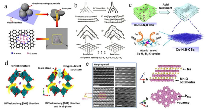 研究證明,納米結(jié)構(gòu)電極材料中的雜原子摻雜和各種空位缺陷等可以調(diào)節(jié)局部金屬離子擴(kuò)散的動(dòng)態(tài)過(guò)程。缺陷的引入有利于提高金屬離子在材料中的插層,可以通過(guò)材料的缺陷來(lái)改變熱力學(xué)和改善動(dòng)力學(xué),從而直接影響金屬離子的嵌入和脫出;此外,缺陷還可以降低相鄰氧層之間的應(yīng)力和靜電排斥,直接改變金屬離子在插層過(guò)程中必須克服的遷移能和擴(kuò)散障礙,有利于促進(jìn)離子的擴(kuò)散和電荷的轉(zhuǎn)移,提高導(dǎo)電性。