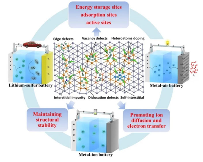 由于電池的容量大小主要取決于電極材料理論位點(diǎn)上容納金屬離子數(shù)量的多少。因此,向納米材料中構(gòu)筑缺陷、摻雜、設(shè)計(jì)位錯(cuò)結(jié)構(gòu)等幾何位點(diǎn),可以存儲(chǔ)更多的金屬離子,有效提高電池電化學(xué)性能。此外,缺陷不僅對(duì)外來(lái)金屬離子具有很強(qiáng)的吸附能力,可為離子的存儲(chǔ)提供廣闊的空間,而且對(duì)鋰-硫電池中的多硫化物具有很強(qiáng)的化學(xué)吸附作用,抑制了多硫化物的溶解和穿梭行為。同時(shí),缺陷的存在可以增加系統(tǒng)的表面能,可以產(chǎn)生大量的活性位點(diǎn),從而促進(jìn)電化學(xué)反應(yīng)動(dòng)力學(xué)。