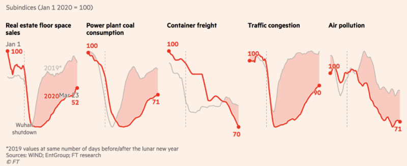 文章以中國為例(如下圖所示),疫情對(duì)中國經(jīng)濟(jì)指標(biāo)(房地產(chǎn)銷售、煤炭消費(fèi)、集裝箱運(yùn)量、交通擁堵、空氣污染)的影響在跌入低谷之后,將在第三、第四季度反彈,但低于年初疫情之前的指標(biāo)。