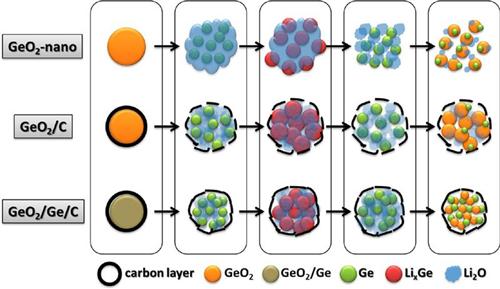 上圖為不同材料的鋰化反應機制的示意圖。其中GeO2在GeO2-nano,GeO2/C以及GeO2/Ge/C中可逆反應機制如圖所示。GeO2 納米結構是轉換反應的必要條件,而碳涂層可提高轉換反應的可逆性,GeO2/Ge/C中Ge元素粒子對于提高GeO2轉換反應可逆性起到了至關重要的作用。