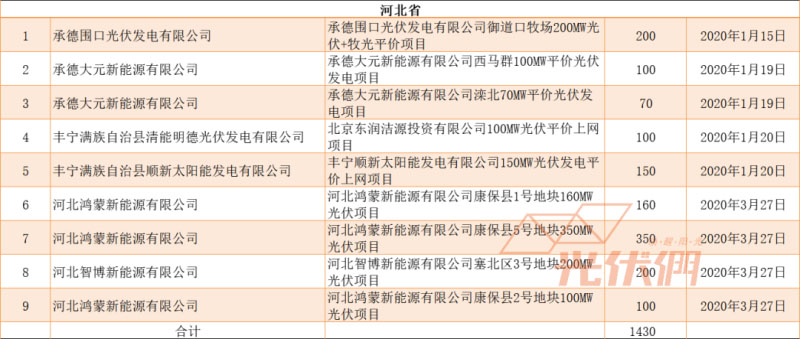 此外,根據(jù)光伏們的統(tǒng)計,2020年以來,河北光伏新增備案約1.43GW,均位于張家口、承德市,詳情如下:
