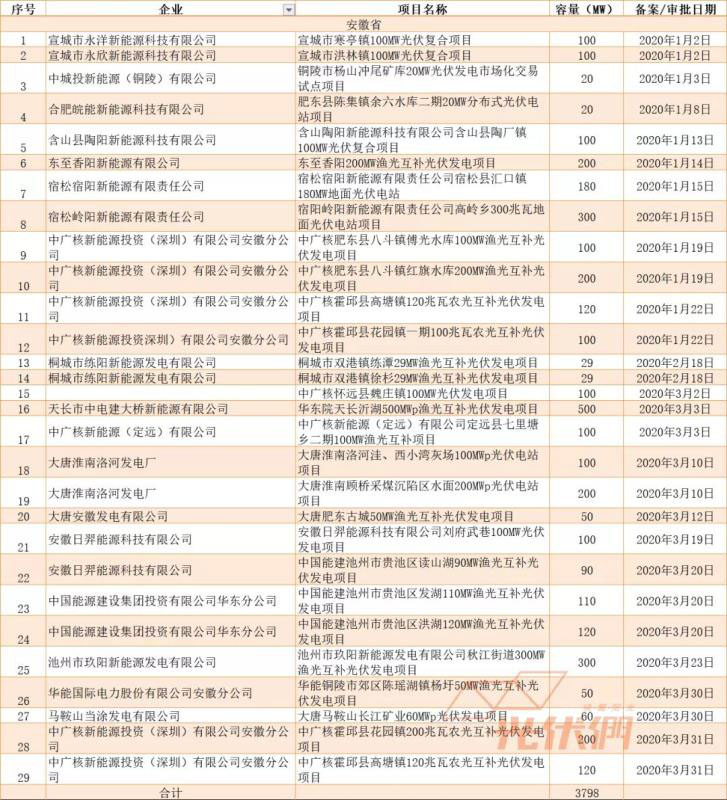 截止到目前,安徽省2020年備案的光伏項目已達3.8GW。
