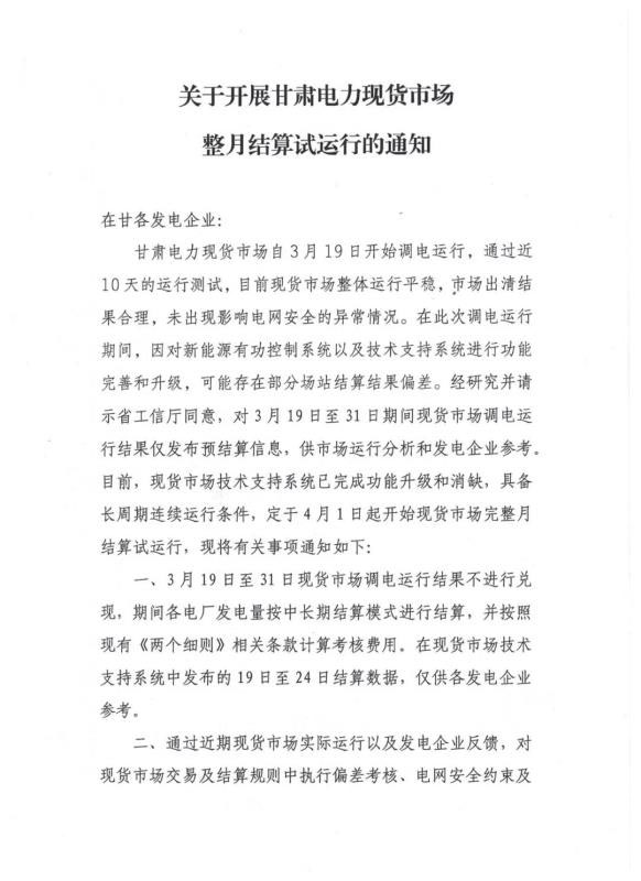 近日,甘肅電力調(diào)度中心發(fā)布《關(guān)于開(kāi)展甘肅電力現(xiàn)貨市場(chǎng)整月結(jié)算試運(yùn)行的通知》?!锻ㄖ诽岢?,目前現(xiàn)貨市場(chǎng)技術(shù)支持系統(tǒng)已完成功能升級(jí)和消缺,具備長(zhǎng)周期連續(xù)運(yùn)行條件,定于4月1日起開(kāi)始現(xiàn)貨市場(chǎng)完整月結(jié)算試運(yùn)行。