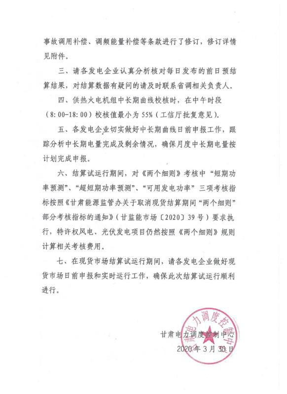 3月19日至31日現(xiàn)貨市場(chǎng)調(diào)電運(yùn)行結(jié)果不進(jìn)行兌現(xiàn),期間各電廠發(fā)電量按中長(zhǎng)期結(jié)算模式進(jìn)行結(jié)算,并按照現(xiàn)有《兩個(gè)細(xì)則》相關(guān)條款計(jì)算考核費(fèi)用。在現(xiàn)貨市場(chǎng)技術(shù)支持系統(tǒng)中發(fā)布的19日至2 4日結(jié)算數(shù)據(jù),僅供各發(fā)電企業(yè)參考。供熱火電機(jī)組中長(zhǎng)期曲線校核時(shí),在中午時(shí)段( 8: 00-18: 00)校核值最小為55%(工信廳批復(fù)意見(jiàn))。各發(fā)電企業(yè)切實(shí)做好中長(zhǎng)期曲線日前申報(bào)工作,跟蹤分析中長(zhǎng)期電量完成及剩余情況,確保月度中長(zhǎng)期電量按計(jì)劃完成申報(bào)。結(jié)算試運(yùn)行期間,對(duì)《兩個(gè)細(xì)則》考核中“短期功率預(yù)測(cè)”、“超短期功率預(yù)測(cè)”、“可用發(fā)電功率”三項(xiàng)考核指標(biāo)按照《甘肅能源監(jiān)管辦關(guān)于取消現(xiàn)貨結(jié)算期間“兩個(gè)細(xì)則”部分考核指標(biāo)的通知》(甘監(jiān)能市場(chǎng)〔2020〕39號(hào))要求執(zhí)行,特許權(quán)風(fēng)電、光伏發(fā)電項(xiàng)目仍然按照《兩個(gè)細(xì)則》規(guī)則計(jì)算相關(guān)考核費(fèi)用。