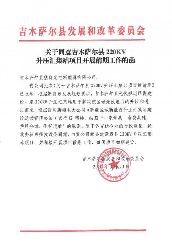 3月23日,猛獅科技旗下吉木薩爾縣猛獅光電新能源有限公司收到吉木薩爾縣發(fā)展和改革委員會(huì)《關(guān)于同意吉木薩爾縣220KV升壓匯集站項(xiàng)目開展前期工作的函》,確定吉木薩爾縣猛獅光電公司牽頭建設(shè)該縣220KV升壓匯集站項(xiàng)目。