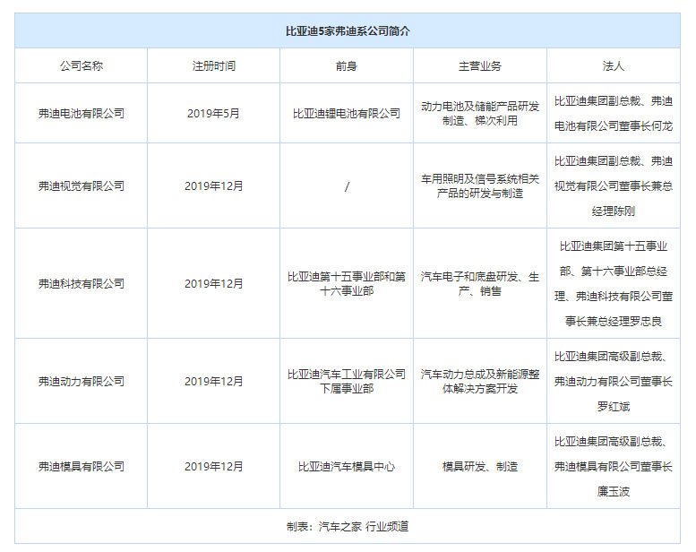 弗迪公司共有5家,分別是弗迪電池有限公司、弗迪視覺有限公司、弗迪科技有限公司、弗迪動(dòng)力有限公司、弗迪模具有限公司。在比亞迪看來,弗迪系和比亞迪的關(guān)系,就像是行星和恒星的關(guān)系,弗迪系的每家公司是圍繞比亞迪新能源產(chǎn)業(yè)鏈優(yōu)勢(shì)而生的行星。