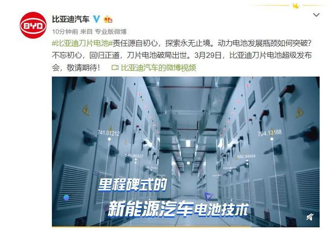 IT之家3月25日消息 根據(jù)比亞迪官網(wǎng)微博的消息,比亞迪將于3月29日14:30在深圳衛(wèi)視舉行刀片電池超級發(fā)布會。