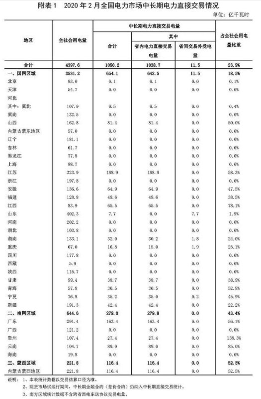 分區(qū)域來看,國家電網區(qū)域中長期電力直接交易電量合計為1326.4億千瓦時,占該區(qū)域全社會用電量的比重為16.4%;南方電網區(qū)域中長期電力直接交易電量合計為542.7億千瓦時,占該區(qū)域全社會用電量的比重為36.2%;蒙西電網區(qū)域中長期電力直接交易電量合計為248.7億千瓦時,占該區(qū)域全社會用電量的比重為50.8%。
