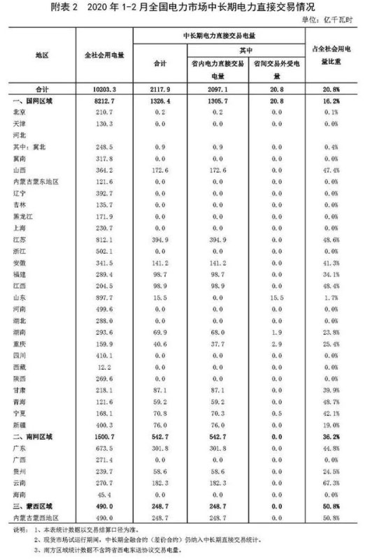 2020年1-2月,全國電力市場中長期電力直接交易電量合計為2117.9億千瓦時,占全社會用電量的為20.8%。其中,省內電力直接交易電量合計為2097.1億千瓦時,省間電力直接交易(外受)電量合計為20.8億千瓦時,分別占全國電力市場中長期電力直接交易電量的99%和1%。