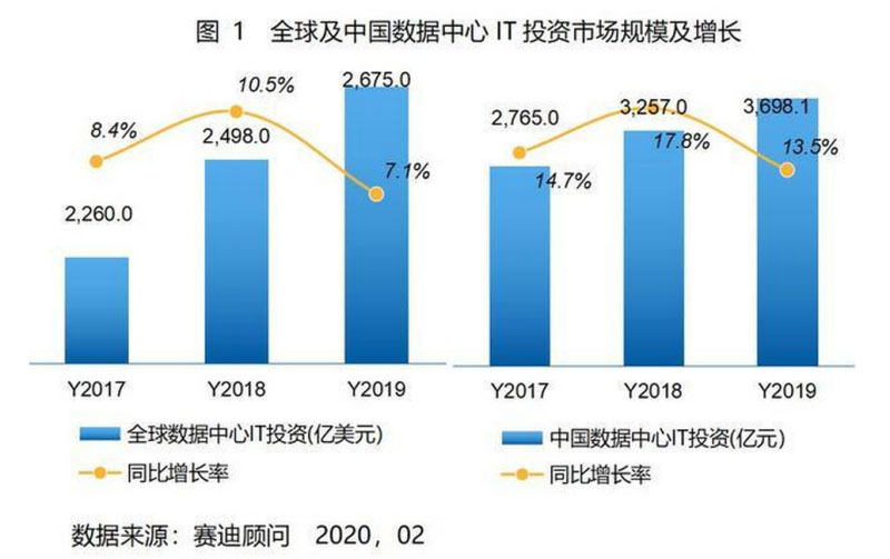 云計(jì)算、大數(shù)據(jù)、物聯(lián)網(wǎng)、人工智能等新一代信息技術(shù)快速發(fā)展,數(shù)據(jù)呈現(xiàn)爆炸式增長(zhǎng),數(shù)據(jù)中心建設(shè)成為大勢(shì)所趨。世界主要國(guó)家和企業(yè)紛紛開(kāi)啟數(shù)字化轉(zhuǎn)型之路,在這一熱潮推動(dòng)下,全球數(shù)據(jù)中心IT投資呈現(xiàn)快速增長(zhǎng)趨勢(shì)。全球及中國(guó)數(shù)據(jù)中心IT投資規(guī)模增長(zhǎng)率均高于全球GDP增長(zhǎng)率(2.3%)和中國(guó)GDP增長(zhǎng)率(6.1%)。