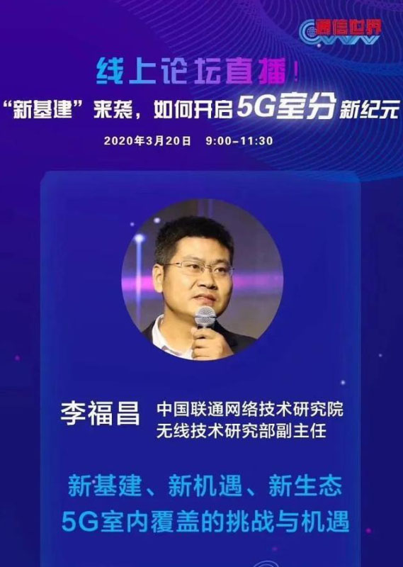 5G時代,將有超過85%的業(yè)務(wù)將發(fā)生在室內(nèi)場景,因此完善的5G室內(nèi)覆蓋顯得尤為重要。在此背景下,通信世界全媒體特策劃5G室分專題線上研討會,中國聯(lián)通網(wǎng)絡(luò)技術(shù)研究院無線研究部副主任李福昌應(yīng)邀出席沙龍并分享了自己在5G室內(nèi)覆蓋領(lǐng)域的經(jīng)驗和思考。在李福昌看來,“新基建”給5G室分帶來了新的機(jī)遇,也為5G室分新生態(tài)提供了萌發(fā)的沃土。