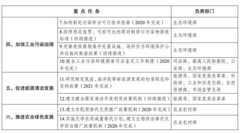 (六)加強(qiáng)工業(yè)污染治理。全面推行污染物排放許可制度,強(qiáng)化工業(yè)企業(yè)污染防治法定責(zé)任。加快制定污染防治可行技術(shù)指南,按照穩(wěn)定連貫、可控可達(dá)的原則制修訂污染物排放標(biāo)準(zhǔn),嚴(yán)格環(huán)境保護(hù)執(zhí)法監(jiān)督,實(shí)現(xiàn)工業(yè)污染源全面達(dá)標(biāo)排放,鼓勵達(dá)標(biāo)企業(yè)實(shí)施深度治理。完善危險廢物集中處置設(shè)施、場所作為環(huán)境保護(hù)公共設(shè)施的配套政策。建立健全責(zé)任清晰、程序合理、科學(xué)規(guī)范的生態(tài)環(huán)境突發(fā)事件預(yù)警和應(yīng)急機(jī)制,建立生態(tài)環(huán)境突發(fā)事件后評估機(jī)制。健全工業(yè)污染環(huán)境損害司法鑒定工作制度,建立完善行政管理機(jī)關(guān)、行政執(zhí)法機(jī)關(guān)與監(jiān)察機(jī)關(guān)、司法機(jī)關(guān)的銜接配合機(jī)制,促進(jìn)工業(yè)污染治理領(lǐng)域處罰信息和監(jiān)測信息共享,充分發(fā)揮檢察機(jī)關(guān)公益職能作用,形成工業(yè)污染治理多元化格局。(最高人民法院、最高人民檢察院、公安部、司法部、生態(tài)環(huán)境部、工業(yè)和信息化部、國家發(fā)展改革委、財(cái)政部等按職責(zé)分工負(fù)責(zé))
