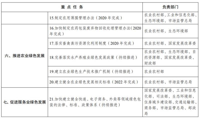 (八)推進(jìn)農(nóng)業(yè)綠色發(fā)展。以綠色生態(tài)為導(dǎo)向,創(chuàng)新農(nóng)業(yè)綠色發(fā)展體制機(jī)制,開展農(nóng)業(yè)綠色發(fā)展支撐體系建設(shè),創(chuàng)新技術(shù)體系、健全標(biāo)準(zhǔn)體系、延伸產(chǎn)業(yè)體系、強(qiáng)化經(jīng)營體系、完善政策體系,為農(nóng)業(yè)綠色發(fā)展提供保障。大力推進(jìn)科學(xué)施肥,建立有機(jī)肥替代化肥推廣政策機(jī)制。實(shí)施化學(xué)農(nóng)藥減量替代計(jì)劃,建立生物防治替代化學(xué)防治推廣政策機(jī)制,支持研發(fā)推廣農(nóng)作物病蟲害綠色防控技術(shù)產(chǎn)品。制定農(nóng)用薄膜管理辦法,建立全程監(jiān)管體系,支持推廣使用生物可降解農(nóng)膜。加快制定農(nóng)藥包裝廢棄物回收處理管理辦法。完善農(nóng)作物秸稈綜合利用制度,以縣為單位整體推進(jìn)秸稈全量化綜合利用。以肥料化和能源化為主要利用方向,落實(shí)畜禽糞污資源化利用制度。完善落實(shí)水產(chǎn)養(yǎng)殖業(yè)綠色發(fā)展政策,依法加強(qiáng)養(yǎng)殖水域?yàn)┩拷y(tǒng)一規(guī)劃。建立飼料添加劑和獸藥使用規(guī)范,健全病死畜禽無害化處理機(jī)制。穩(wěn)步推進(jìn)耕地輪作休耕制度試點(diǎn)。健全農(nóng)業(yè)循環(huán)經(jīng)濟(jì)推廣制度,建立農(nóng)業(yè)綠色生產(chǎn)技術(shù)推廣機(jī)制。落實(shí)農(nóng)業(yè)綠色發(fā)展稅收支持政策。建立健全農(nóng)業(yè)綠色發(fā)展相關(guān)標(biāo)準(zhǔn),加快清理、廢止與農(nóng)業(yè)綠色發(fā)展不適應(yīng)的標(biāo)準(zhǔn)和行業(yè)規(guī)范。(農(nóng)業(yè)農(nóng)村部、國家發(fā)展改革委、工業(yè)和信息化部、財(cái)政部、自然資源部、生態(tài)環(huán)境部、水利部、稅務(wù)總局、市場監(jiān)管總局等按職責(zé)分工負(fù)責(zé))