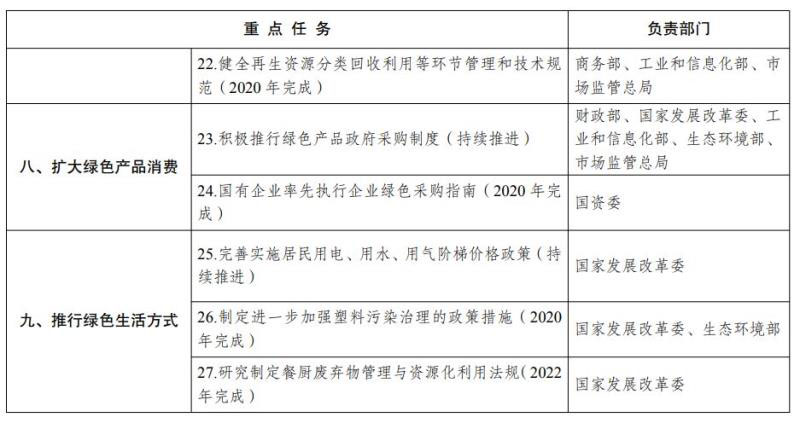 (九)促進(jìn)服務(wù)業(yè)綠色發(fā)展。在市政公用工程設(shè)施和城鄉(xiāng)公共生活服務(wù)設(shè)施的規(guī)劃、建設(shè)、運(yùn)營、管理有關(guān)標(biāo)準(zhǔn)和規(guī)范制修訂中,全面貫徹綠色發(fā)展理念,提升綠色化水平。完善綠色物流建設(shè)支持政策。加快建立健全快遞、電子商務(wù)、外賣等領(lǐng)域綠色包裝的法律、標(biāo)準(zhǔn)、政策體系,減少過度包裝和一次性用品使用,鼓勵使用可降解、可循環(huán)利用的包裝材料、物流器具。健全再生資源分類回收利用等環(huán)節(jié)管理和技術(shù)規(guī)范。(住房城鄉(xiāng)建設(shè)部、自然資源部、國家發(fā)展改革委、工業(yè)和信息化部、司法部、生態(tài)環(huán)境部、交通運(yùn)輸部、商務(wù)部、市場監(jiān)管總局、鐵路局、民航局、郵政局等按職責(zé)分工負(fù)責(zé))
