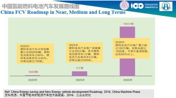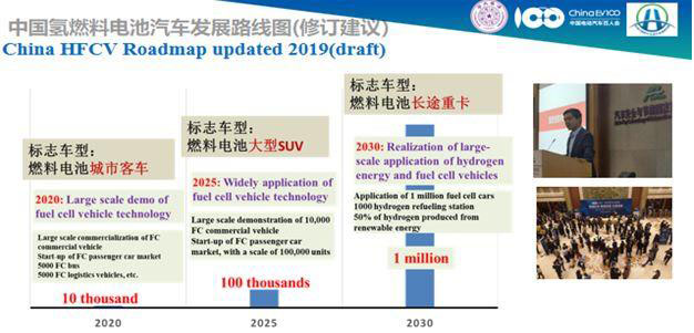 王賀武的解釋是路線圖分為近、中、遠三期:近期到2020年時,中國將運行5,000輛FCV(實際已經超過6000輛),并在高效制氫、儲存、運輸、分配以及加氫站等技術上有突破;中期目標是在2025年時,實現10000輛商用車和40000輛乘用車的運行;而遠期目標是到2030年時,完成100萬輛FCV的運行,其氫氣來源50%將來自于可再生能源制氫,此外還將運營超過1000個加氫站,以保障氫能燃料電池汽車的正常行駛。