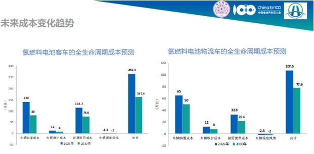 目前,氫燃料電池大巴和物流車的總擁有成本分別為448.1萬元人民幣、200萬元人民幣。隨著產業(yè)不斷發(fā)展,供應鏈不斷擴大,成本將不斷降低,預計2025年時氫燃料電池大巴和物流車的總擁有成本分別降低到264.4萬元人民幣、107.5萬元人民幣,而到2030年時氫燃料電池大巴和物流車總擁有成本分別可以達到161.6萬元人民幣、77.6元人民幣。