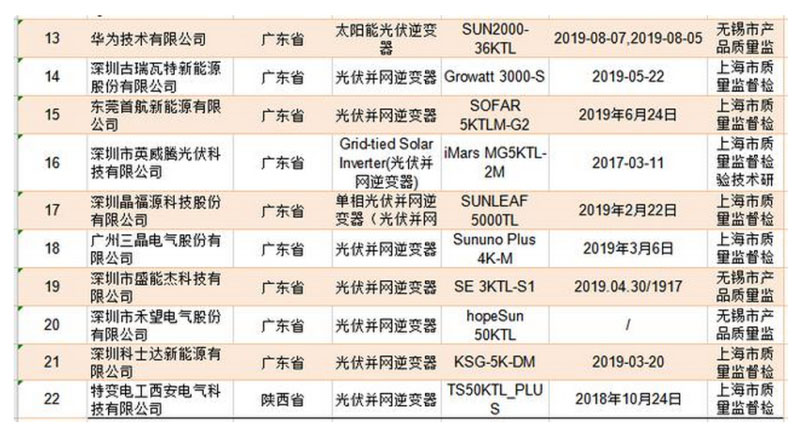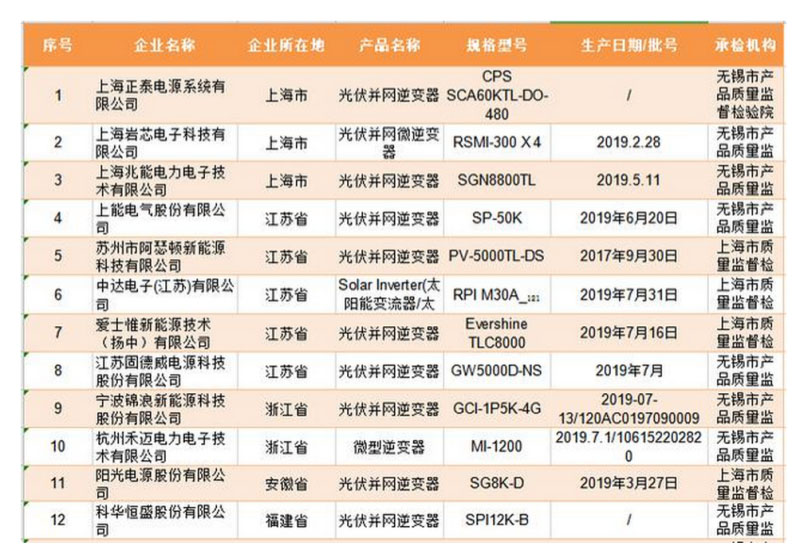 近期,市場監(jiān)管總局公布了2019年并網(wǎng)光伏逆變器質(zhì)量國家監(jiān)督抽查情況。共抽查了7個?。ㄊ校?,包括華為,陽光,錦浪科技、禾望,固德威,特變電工、科士達(dá)在內(nèi)的23家光伏逆變器企業(yè)成產(chǎn)的23批次光伏并網(wǎng)逆變器產(chǎn)品,其中1批次產(chǎn)品不合格,不合格發(fā)現(xiàn)率為4.3%。