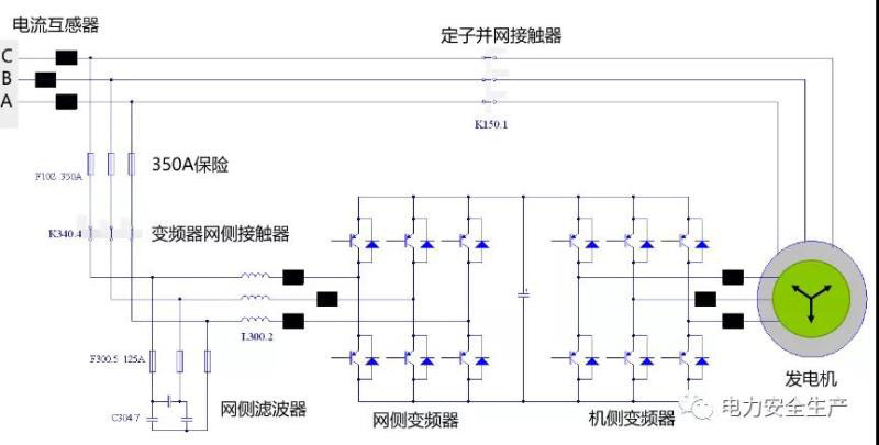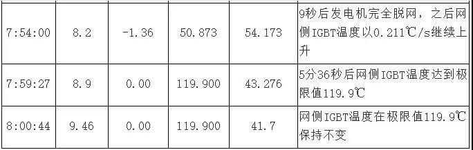 通過分析網側IGBT溫度突變的起始點、溫度達到極限值的終止點數(shù)據和故障信息可知,機組在正常運行狀態(tài)下,網側IGBT突然出現(xiàn)內部過流故障,造成IGBT內部溫度檢測回路開路(開路會導致溫度達到極限值)。網側IGBT過電流,將直接沖擊上級回路的350A保險,導致保險熔斷,機組報出保險熔斷故障。6min后線路跳閘。